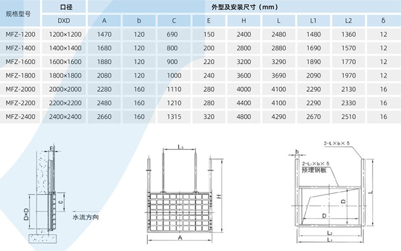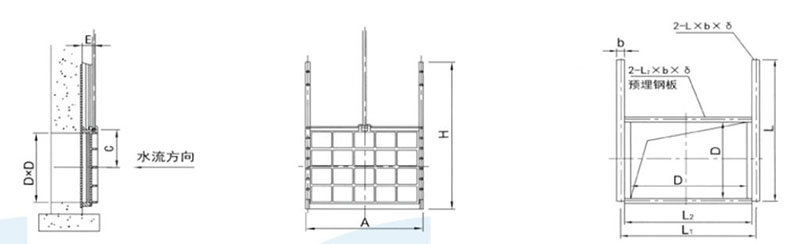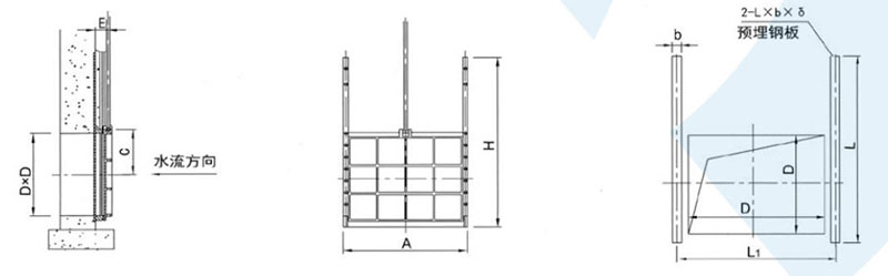 2、闸门安装在墙壁上,门板一般设于迎水面(单向),承受最大压力0.1Mpa;门板正反两面都承受水压(双向);承受最大反向压力0.03Mpa。
