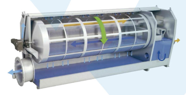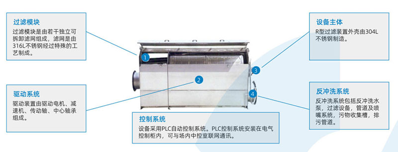 装置由设备结构模块、过滤模块、驱动系统、反冲洗系统、自控系统组成。污水流入转鼓内,由于重力的作用由滤网内侧向外侧流出,水中的悬浮物被截留在不锈钢滤网内侧。转鼓缓慢转动,反冲洗泵抽取滤后出水对滤网进行反冲洗。冲洗水通过位于转鼓顶部的喷头由滤网外侧向内侧对滤网进行冲洗,冲洗下来的颗粒物质由反冲洗水收集槽收集,并通过排污管排出设备。