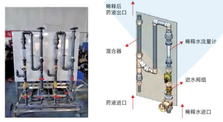后稀释装置将投加泵后端药液按照一定倍数稀释后直接送至投加点的一种在线稀释装置。稀释系统主要是用来稀释和处理由干粉机配制的高浓度溶液,这样可以增加干粉机设备的干粉投加量。主要由手动隔膜阀、压力调节阀、电磁阀、浮子流量计、止回阀、管道混合器组成。