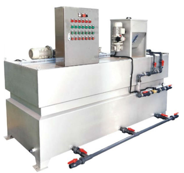 高分子絮凝剂配制及投加装置主要由溶药箱、储药箱、高分子絮凝剂料斗、高分子解疑剂投加机,预漫润系统,搅拌机,进水组件,液位传感系统,投加泵,稀释装置,管路阀门,自控等部分组成。在贮药箱药液处于低位时自动启动进水电磁阀,预浸润系统向溶药箱开始进水。延时2min后,高分子絮凝剂投加机开始投药,同时搅拌机工作。时间可通过电柜控制面板上输入元件设定。当进水系统、预浸润系统及投药系统运行全高水位后停止预浸润系统,投药系统与进水系统,而保持搅拌系统、搅拌机一直工作。搅拌机、加药泵运行,停止的工作状况可由加药控制柜或远控确定。