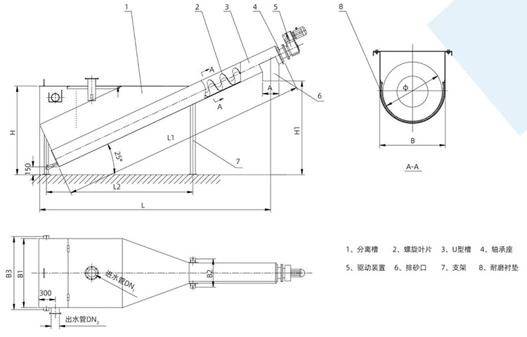 该设备采用无轴螺旋式,砂水混合液从分离器上部输入,砂砾在砂水分离槽内靠重力沉降,并利用无轴螺旋体的旋转,将砂砾沿25%的U型槽逐渐推至出口处,落入接料筒后外运,分离水则从分离槽溢流口排出,以改善操作环境和利于外运。