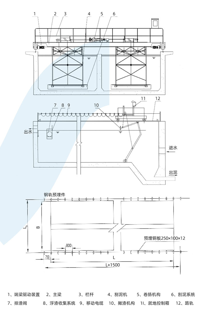 该设备由护栏、刮泥桁架、刮泥耙及导轨、刮泥桥、行走轮、轨道、提升机构、驱动机构等组成。